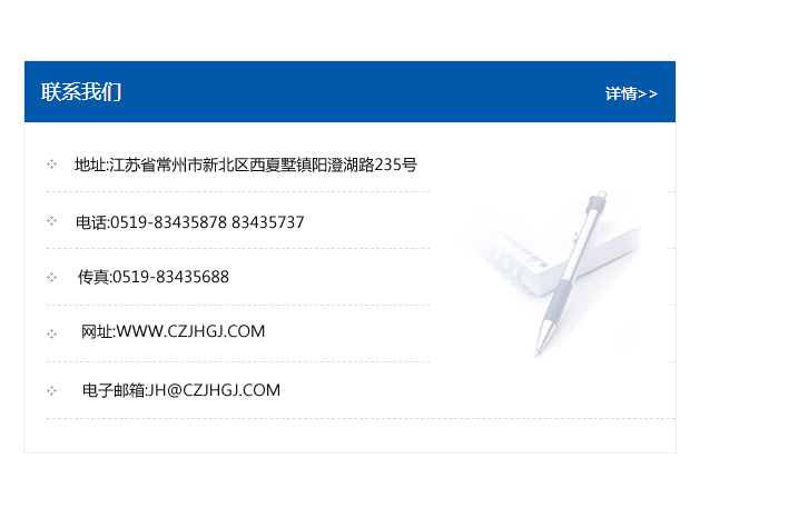 地址:常州市新北區友邦商務大廈1幢16、17層  電話:0519-85101652  傳真:0519-85112595  郵編:213022  網址:www.cz-jiayue_cn.028sxw.com  郵箱:xiajifengaa@163.com